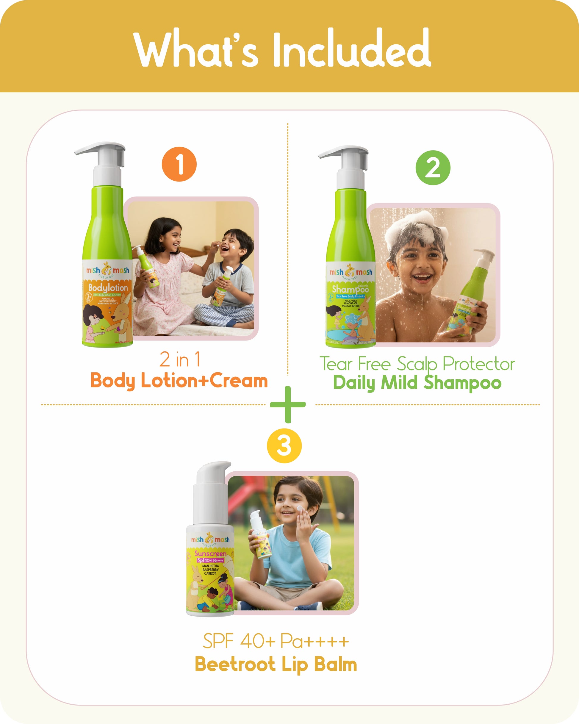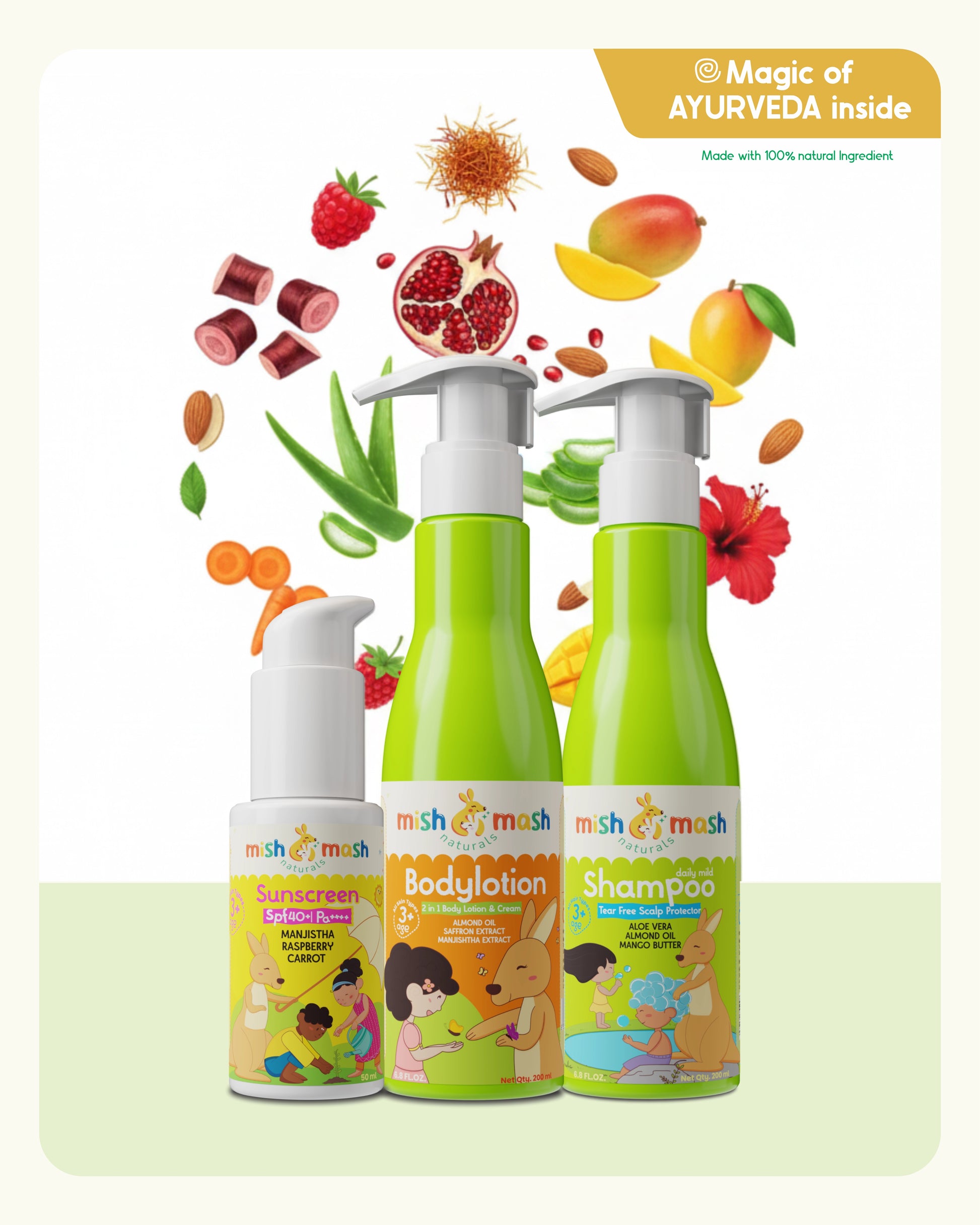 Complete nourishment for your child’s skin and scalp — hydrate, protect, and strengthen naturally with Ayurvedic care for kids aged 3–14.