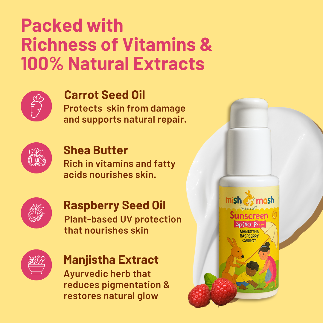 Ayurvedic sun protection with Raspberry, Manjistha & Sandalwood. Non-sticky, sweatproof & no white cast — perfect for daily play.
